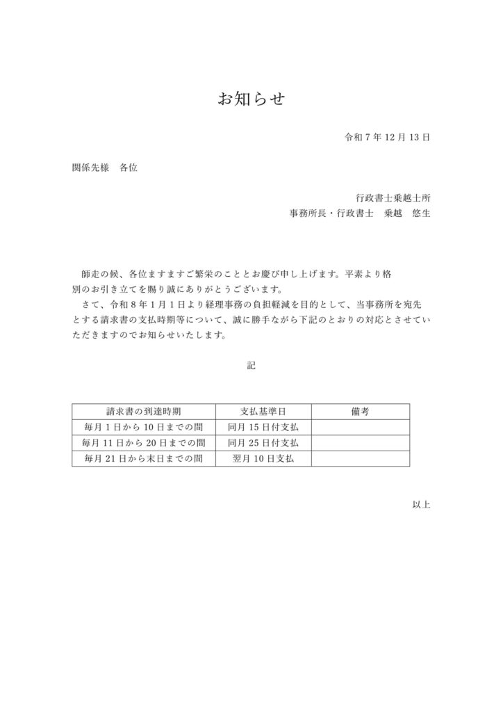 代行報酬等のお支払時期に関しまして、令和8年1月1日より下記のとおりとさせていただきます。