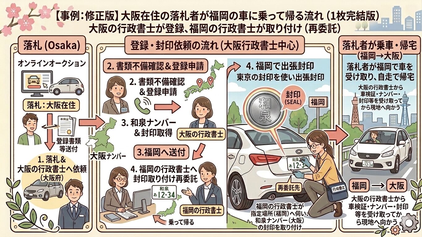 今の所有者から登録書類を送ってもらう→大阪の行政書士に登録を依頼する→福岡の行政書士にナンバープレートと封印の取付を依頼する→福岡の行政書士が大阪の行政書士より車検証等を受け取り出張封印をする→落札者が乗って帰る。