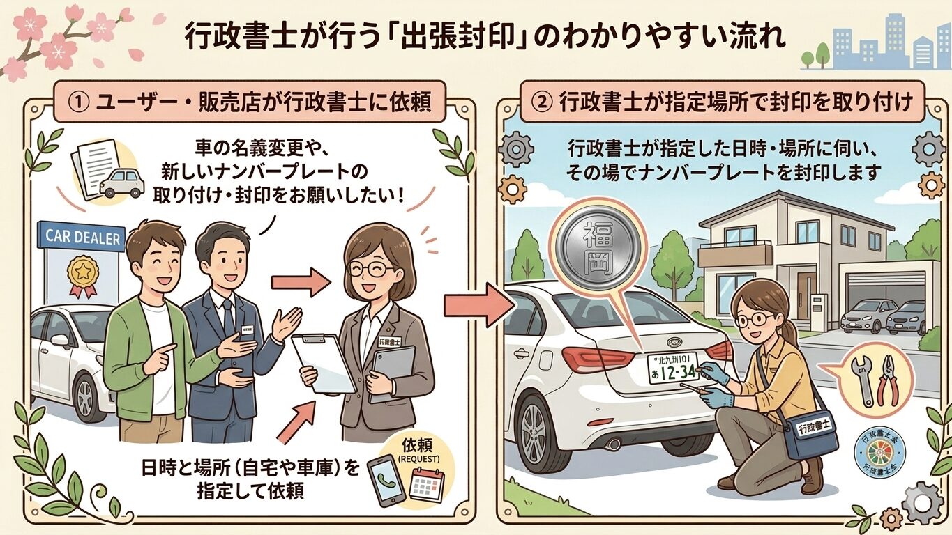 出張封印とは、行政書士のみに認められた権限で、通常は陸運局内でしか取付ができない「封印」を陸運局以外の場所(例.ユーザーの自宅、整備工場、販売店の敷地など)で取り付けることができます。